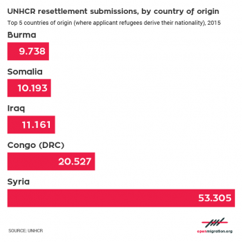Top 3 countries to which refugees are submitted for resettlement and number of refugees who arrived there in resettlement, 2015.Find this infographic in this article: