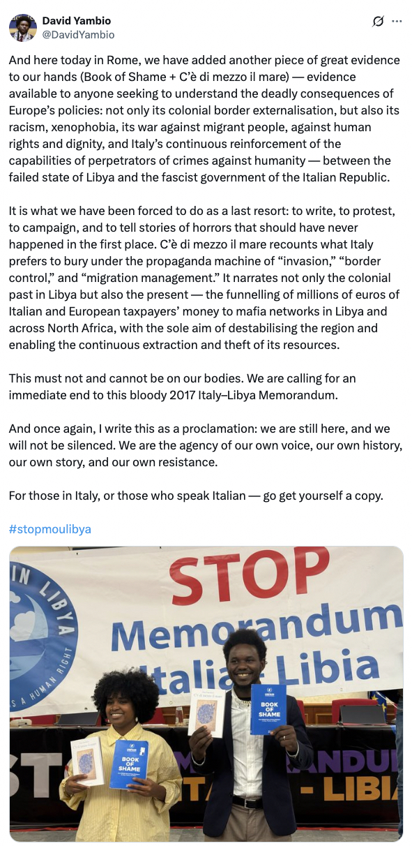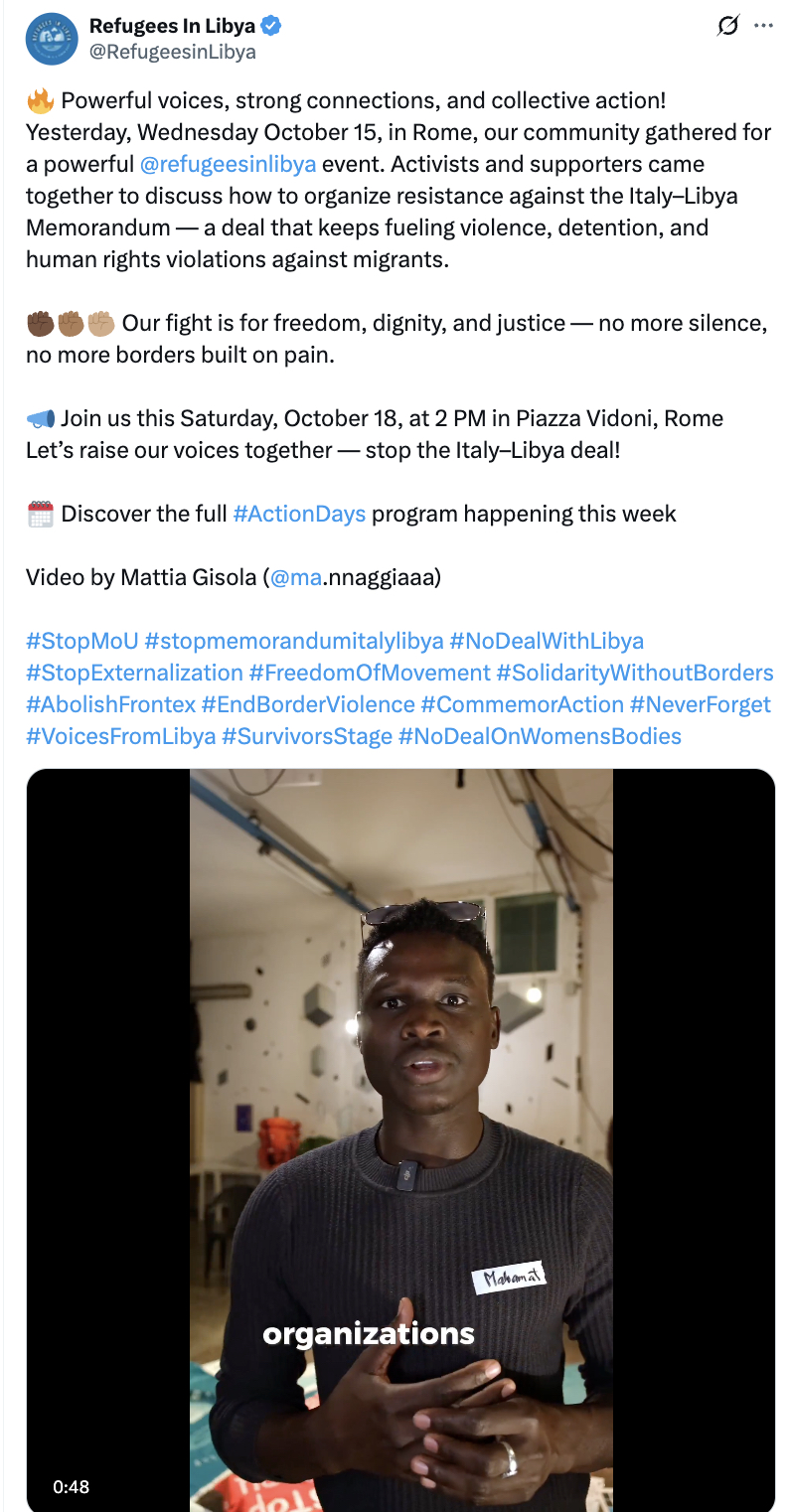 “Il memorandum Italia-Libia è nato con l’obiettivo vago di contrastare l’immigrazione irregolare e il traffico di esseri umani. In sette anni, denunciano le organizzazioni presenti alla conferenza stampa, ha mostrato il suo vero intento iniziale: un meccanismo di respingimenti illegali e violazioni sistematiche dei diritti umani da parte della cosiddetta guardia costiera libica. Proprio Sea-Watch, impegnata nel soccorso nel Mediterraneo, ha presentato un report in cui documenta oltre 60 casi di violenza commessi dalle milizie libiche a partire dal 2016”, scrive la giornalista Albertina Sanchioni su Il Manifesto. Contro il Memorandum il collettivo Refugees in Libya ha organizzato giornate di divulgazione e mobilitazione a Roma: